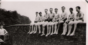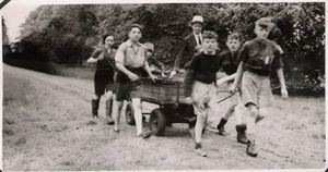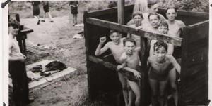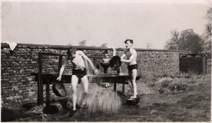 Scouts arriving at the CampsiteScout Patrol with Lord Stamford in the Home ParkPatrol on Kit InspectionWashing up with boundary wall and toilet block in backgroundCold water showers in an old packing caseEnjoying the Easter sunshine sat on the boundary wall
