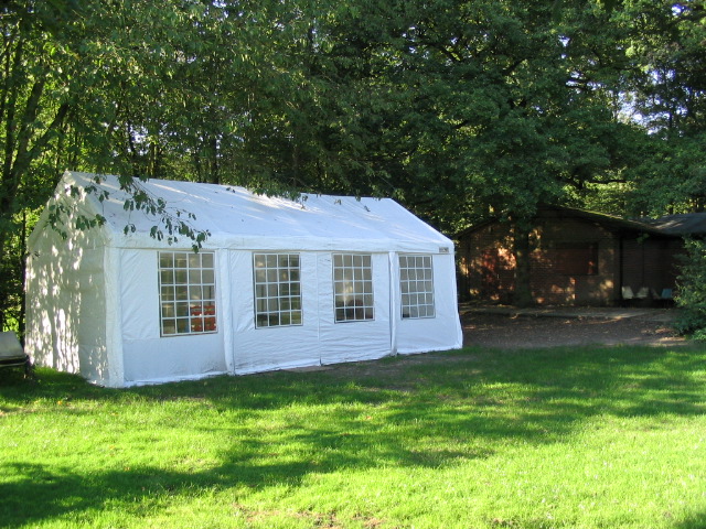 Frank Harrop Lodge – refurbished from the original red concrete floor, (where we stored the tractor and canoe trailer) to carpeted indoor accommodation with bedroomsChairs and tables provided Outdoor dining shelter with Frank Harrop in the background