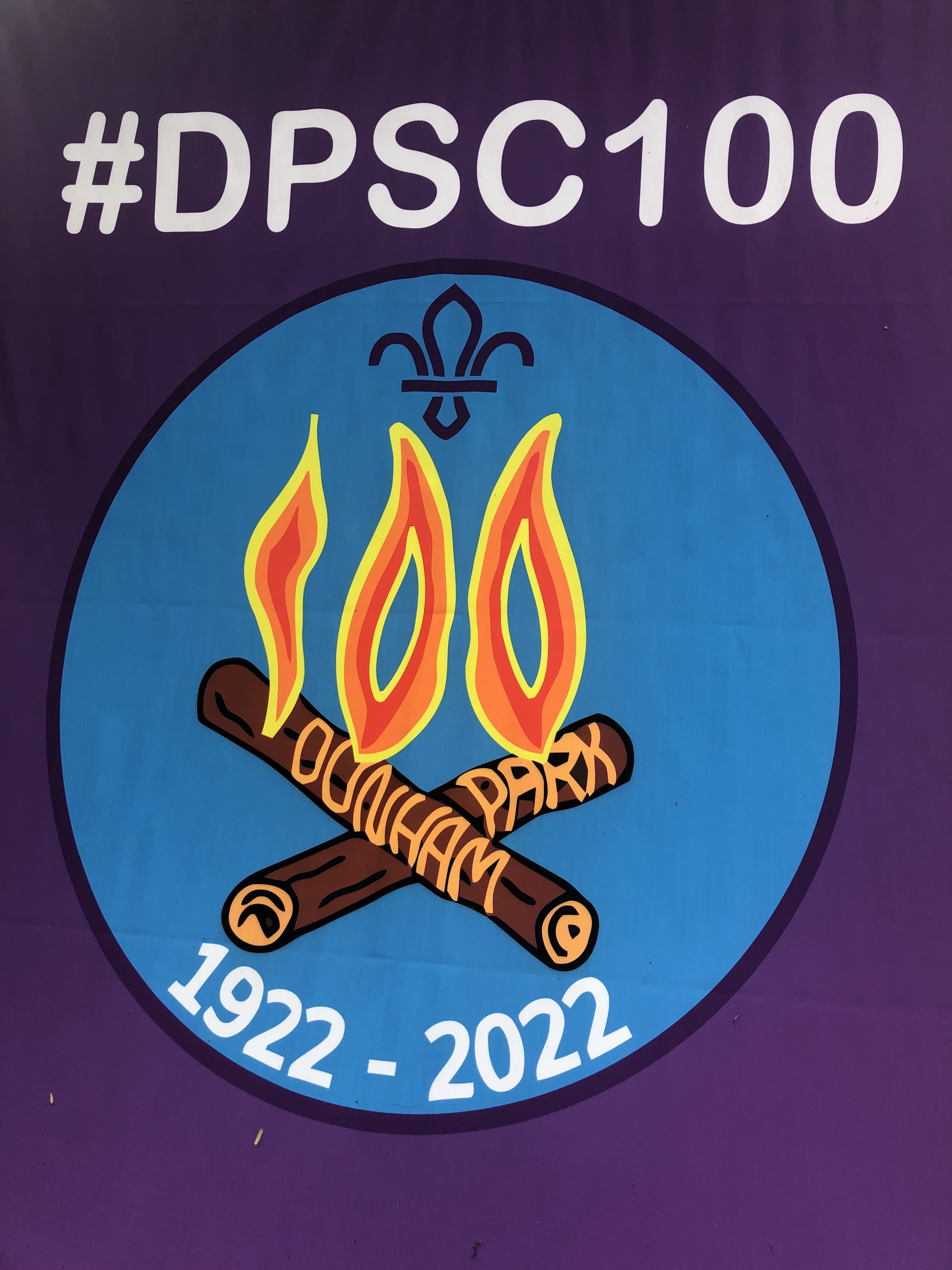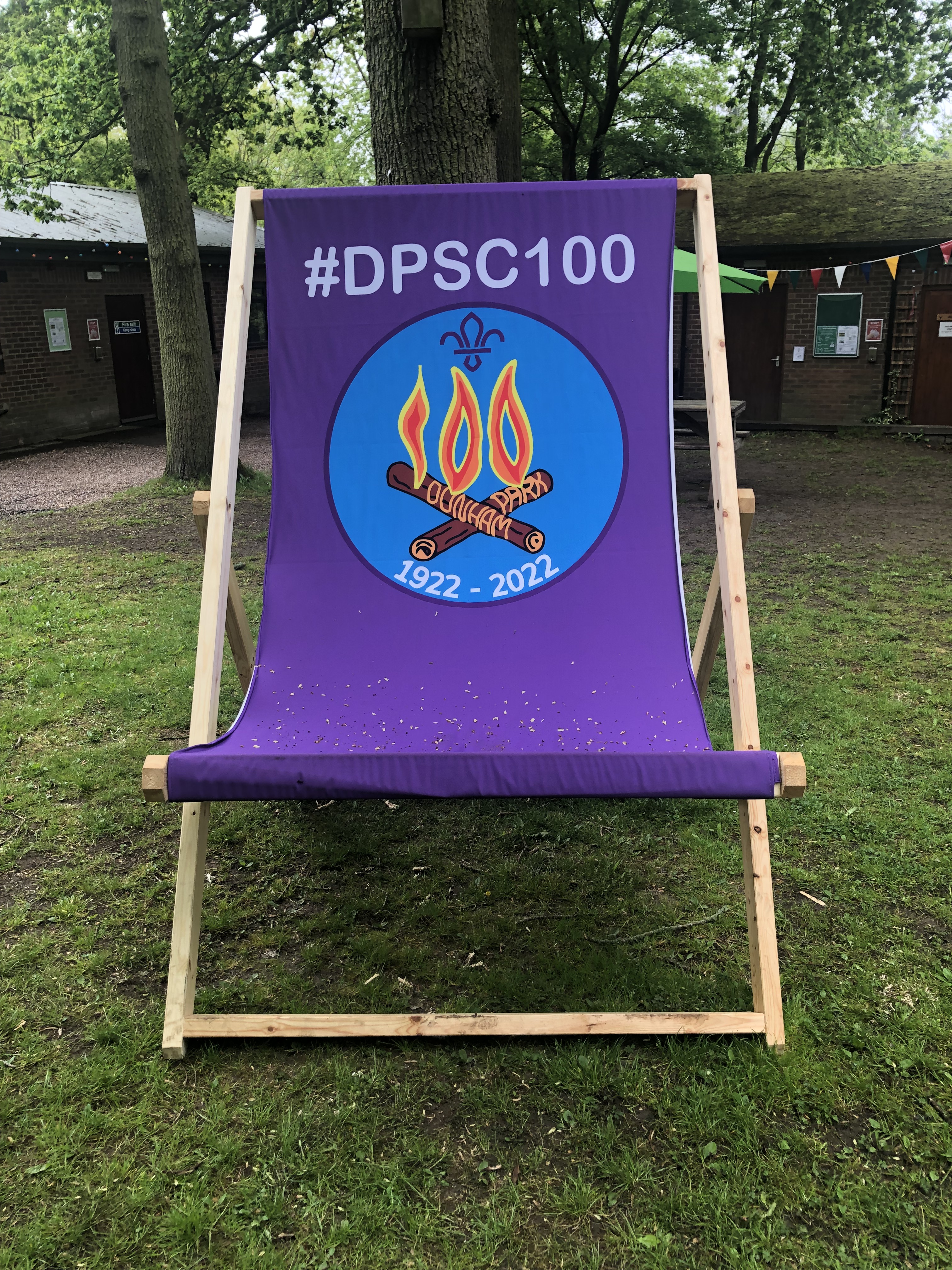 Dunham Park Scout Camp 2022 100 years badges – available from the tuck shop Deck chair ready for selfies!